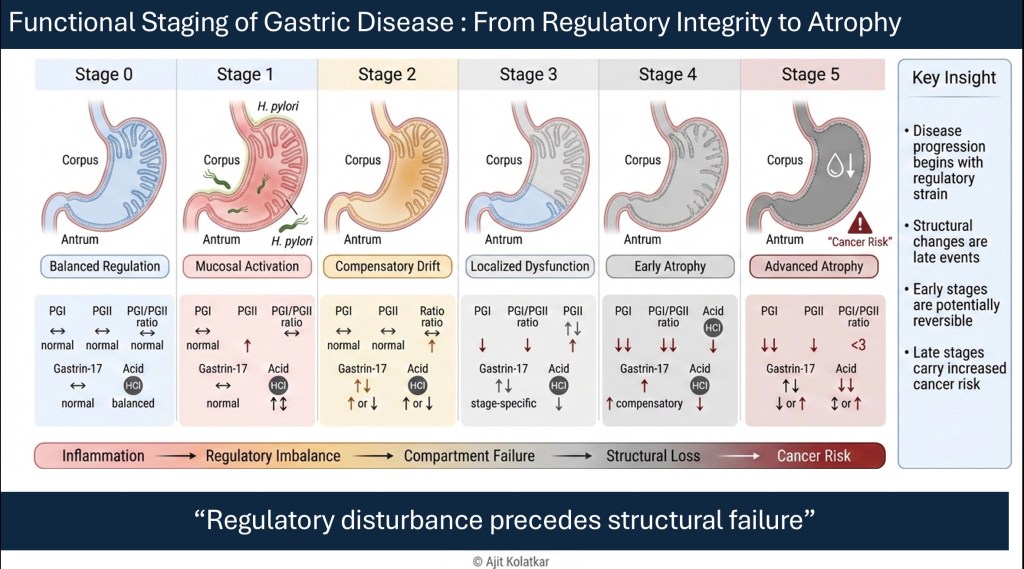 The stomach is a resilient organ. It tolerates repeated insults, compensates, and adapts acid production. It modifies feedback loops and redistributes secretory activity. These adaptive phases are precisely where staging becomes meaningful.
