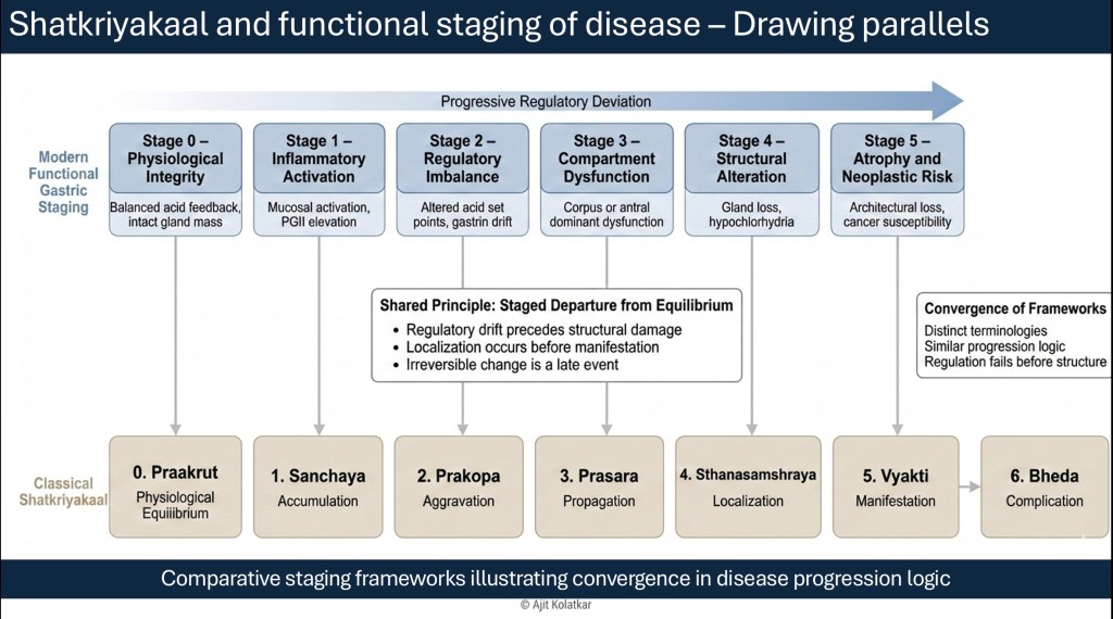 The language differs from contemporary gastroenterology, but the staging logic converges. Both frameworks recognize that disease evolves through progressive regulatory imbalance before structural collapse.